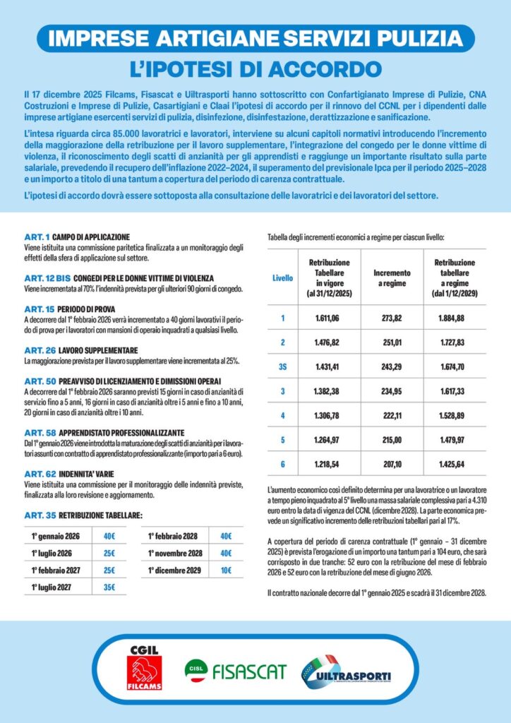 Con il rinnovo un riconoscimento importante per le oltre 85.000 lavoratrici e lavoratori del comparto Hanno preso il via le assemblee di consultazione nei luoghi di lavoro sull’Ipotesi di accordo sul nuovo Contratto nazionale applicato ai dipendenti dalle imprese artigiane esercenti servizi di pulizia, disinfezione, disinfestazione, derattizzazione e sanificazione. L’intesa è stata siglata il 17 dicembre dai sindacati di […]