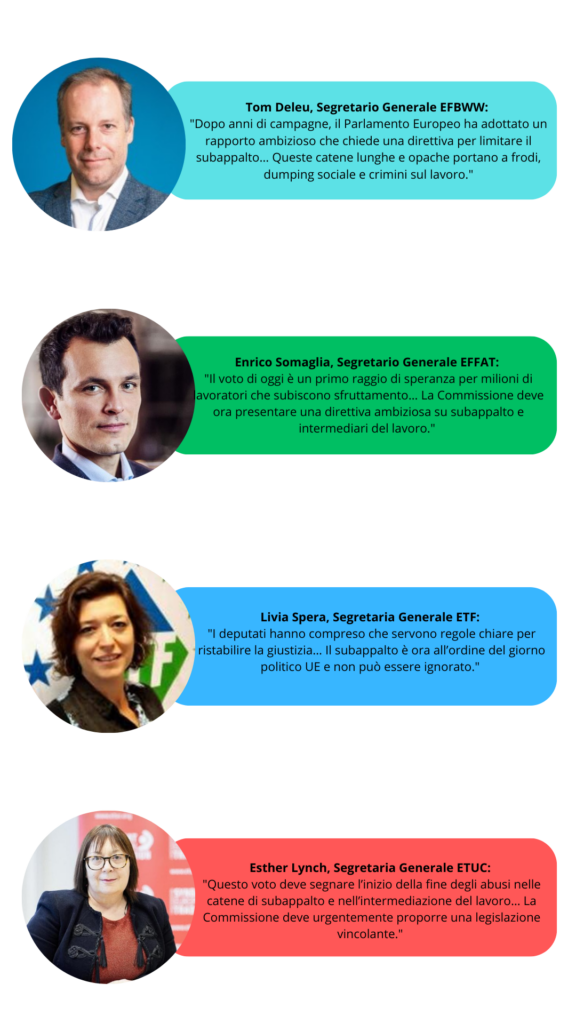 Sebbene alcuni passi essenziali del testo proposto siano stati rimossi, come ad esempio il limite a due livelli e la piena responsabilità solidale, le Federazioni hanno ugualmente accolto con favore il voto come passo chiave per contrastare lo sfruttamento, il dumping sociale e la concorrenza sleale nei settori costruzioni, agricoltura, alimentare, turismo e trasporti. Finalmente il lavoro dignitoso, diretto e rispettoso delle persone è nell’agenda del Parlamento Europeo.